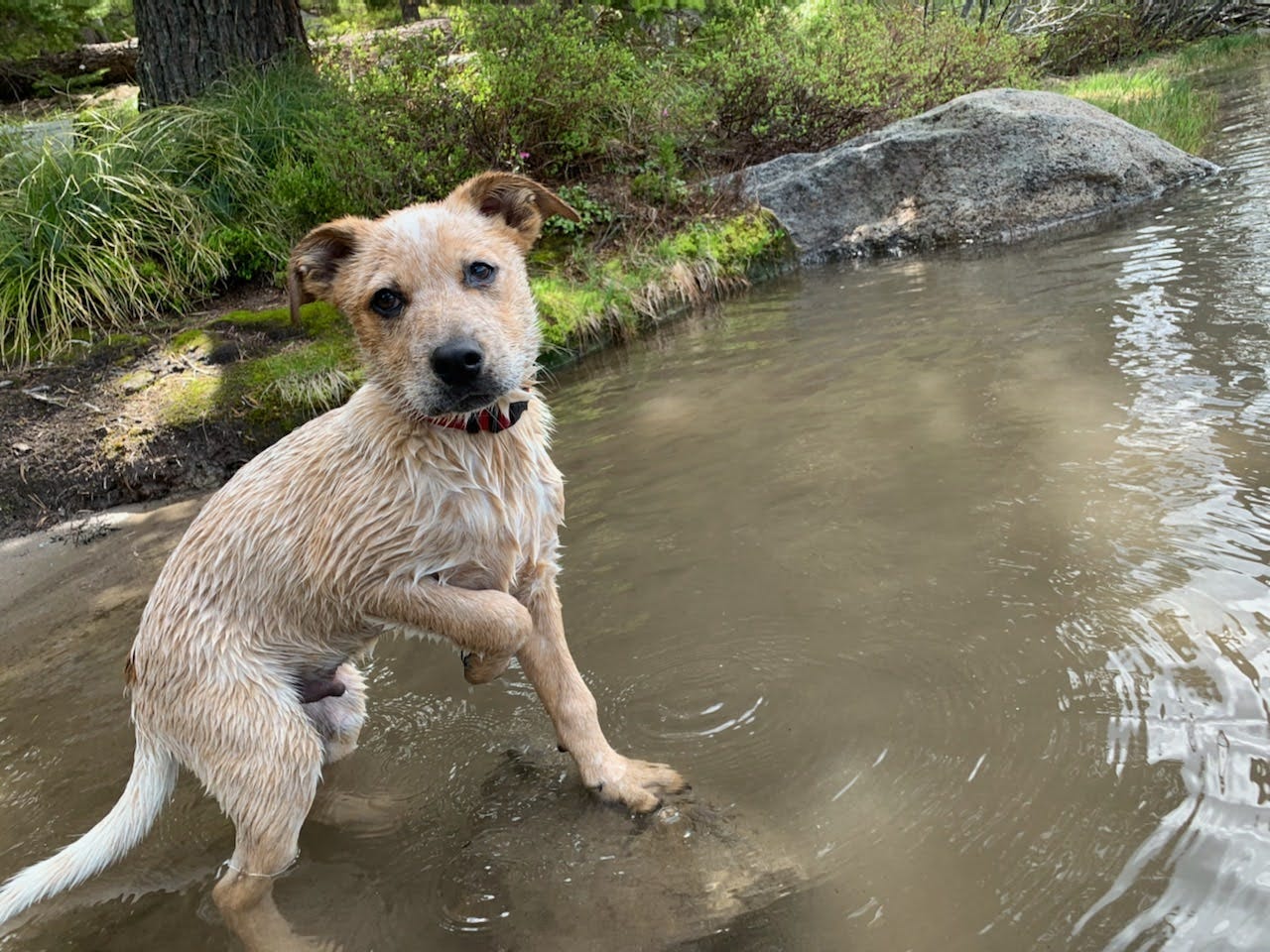 When the nozzle spurts on, he shrinks into sagging shoulders, drops sad ears to the ground, and looks at you like there is no worse fate than getting unwillingly thrown into water.
